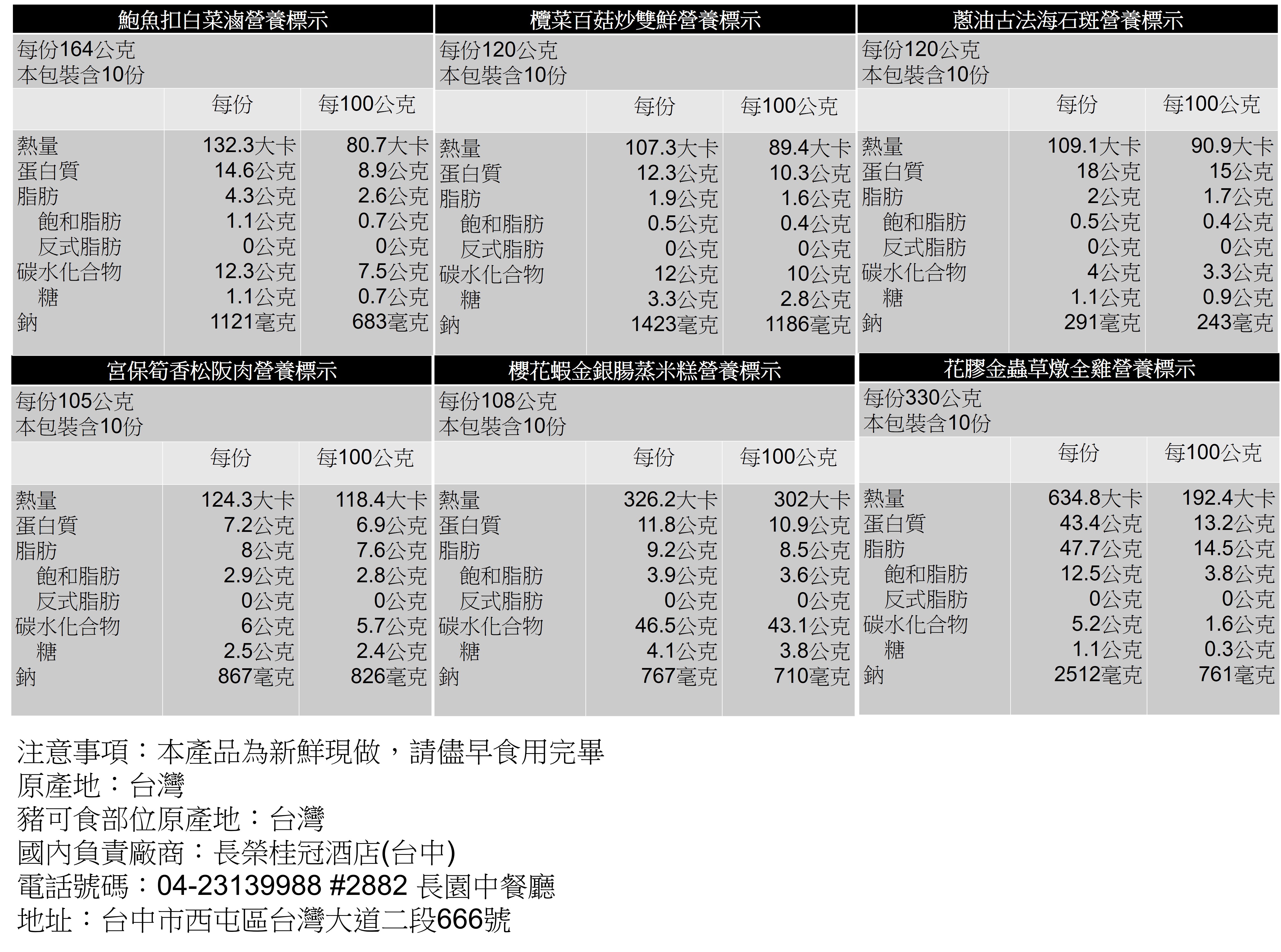 1.年菜提貨期間:2026年2月16日至2026年2月22日止 2.年菜提貨地點: 2/16除夕當天11:00~16:00至1樓大廳右側取貨 其餘日期11:30-13:00、17:30-19:00須至2樓長園廳取貨 3.配合政府環保限塑的推廣,2024年起外帶年菜的容器將不主動提供"可微波之容器"。此價格不含盛裝容器乙組,有微波盒裝盛需求請記得加購,相關細節請電洽04-23139988分機2882由專人協助處理,感謝您的配合 4.未加購微波盒的客人請注意,最慢請在領貨前5天將容器送到指定餐廳做後續清洗消毒的處理。若未送達,恕無法在指定日期提貨,敬請見諒 5.如有任何問題歡迎來電洽詢04-23139988分機2882由專人協助處理,感謝您的配合 |
