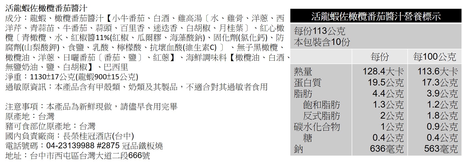 1.冠品鐵板燒西式年菜外帶-活龍蝦佐橄欖蕃茄醬汁(4人份)(800-900G/隻) 2.年菜提貨期間:2026年2月16日至2月21日止 3.年菜提貨地點:2樓冠品廳 2/16除夕當天取貨時間11:00~12:00,15:00~17:00 2/17~2/21取貨時間11:30~13:00 / 17:30~19:00 4.配合政府環保限塑的推廣,2024年起外帶年菜的容器將不主動提供"可微波之容器"。此價格不含盛裝容器乙組,有微波盒裝盛需求請記得加購,相關細節請電洽04-23139988分機2875由專人協助處理,感謝您的配合 5.未加購微波盒的客人請注意,最慢請在領貨前5天將容器送到指定餐廳做後續清洗消毒的處理。若未送達,恕無法在指定日期提貨,敬請見諒 6.如有任何問題歡迎來電洽詢04-23139988分機2875由專人協助處理,感謝您的配合 |