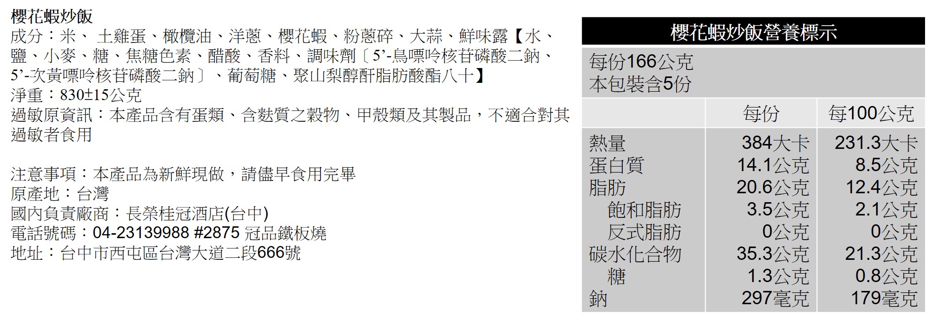 1.冠品鐵板燒西式年菜外帶-櫻花蝦炒飯( 4人份) 2.年菜提貨期間:2026年2月16日至2月21日止 3.年菜提貨地點:2樓冠品廳 2/16除夕當天取貨時間11:00~12:00,15:00~17:00 2/17~2/21取貨時間11:30~13:00 / 17:30~19:00 4.配合政府環保限塑的推廣,2024年起外帶年菜的容器將不主動提供"可微波之容器"。此價格不含盛裝容器乙組,有微波盒裝盛需求請記得加購,相關細節請電洽04-23139988分機2875由專人協助處理,感謝您的配合 5.未加購微波盒的客人請注意,最慢請在領貨前5天將容器送到指定餐廳做後續清洗消毒的處理。若未送達,恕無法在指定日期提貨,敬請見諒 6.如有任何問題歡迎來電洽詢04-23139988分機2875由專人協助處理,感謝您的配合 |