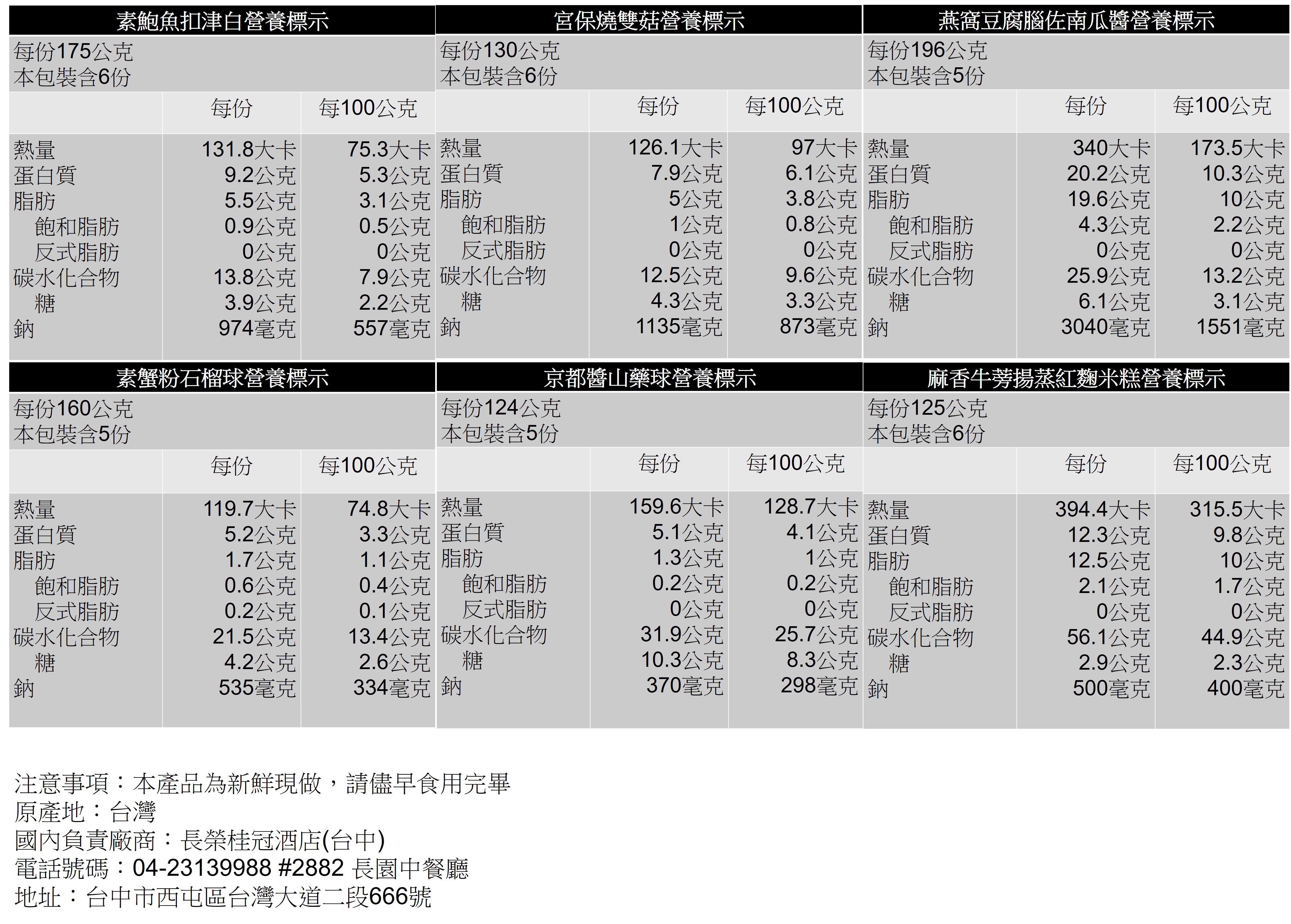 1.年菜提貨期間:2026年2月16日至2026年2月22日止 2.年菜提貨地點: 2/16除夕當天11:00~16:00至1樓大廳右側取貨 其餘日期11:30-13:00、17:30-19:00須至2樓長園廳取貨 3.配合政府環保限塑的推廣,2024年起外帶年菜的容器將不主動提供"可微波之容器"。此價格不含盛裝容器乙組,有微波盒裝盛需求請記得加購,相關細節請電洽04-23139988分機2882由專人協助處理,感謝您的配合 4.未加購微波盒的客人請注意,最慢請在領貨前5天將容器送到指定餐廳做後續清洗消毒的處理。若未送達,恕無法在指定日期提貨,敬請見諒 5.如有任何問題歡迎來電洽詢04-23139988分機2882由專人協助處理,感謝您的配合 |