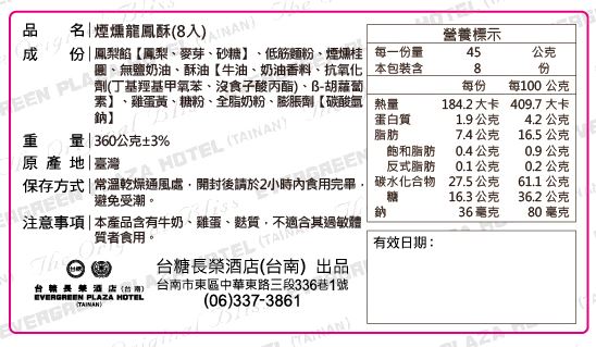 ◆ 成分:鳳梨餡【鳳梨、麥芽、砂糖】、低筋麵粉、煙燻桂圓、無鹽奶油、酥油【牛油、奶油香料、抗氧化劑(丁基羥基甲氧苯、沒食子酸丙酯)、ß-胡蘿蔔素】、雞蛋黃、糖粉、全脂奶粉、膨脹劑【碳酸氫鈉】 ◆ 過敏原:牛奶、雞蛋、麩質 ◆ 原產地:台灣 |