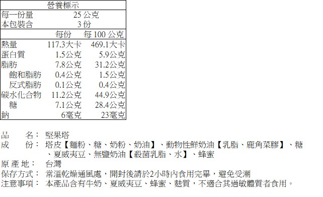 ◆ 重量:40公克±9%/塊(堅果塔) |