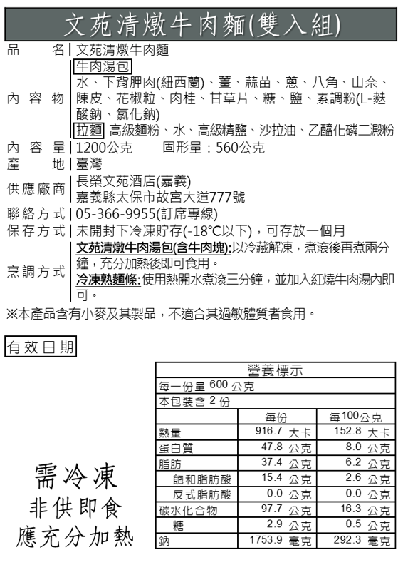 | 文苑清燉牛肉麵禮盒(冷凍雙入組)(牛肉 : 紐西蘭/澳洲) 商品編號 : 0000316 | 售價 NT$660 |